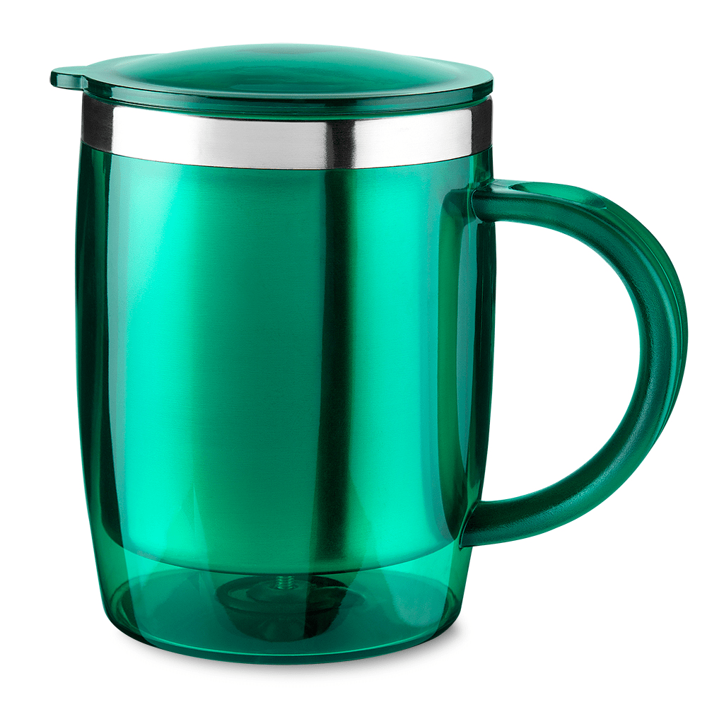 Caneca plástica com área interna em inox, com capacidade de 400ml. A caneca possui tampa de fechamento através de um encaixe feito por um anel de silicone.