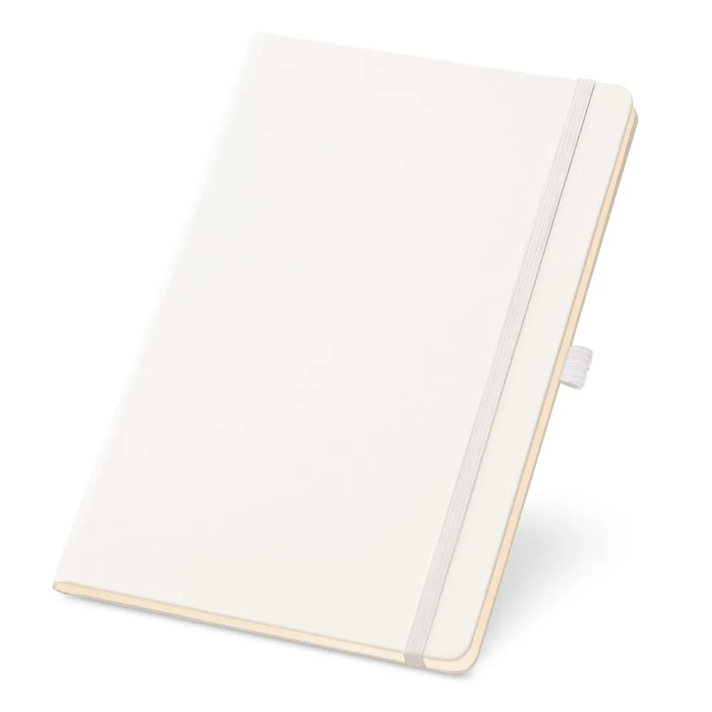 Caderno A5 de capa dura, com 80 folhas lisas em cor marfim. Com bolso interior, fita separadora, elástico e suporte para esferográfica (não inclusa). 137 x 210 mm
