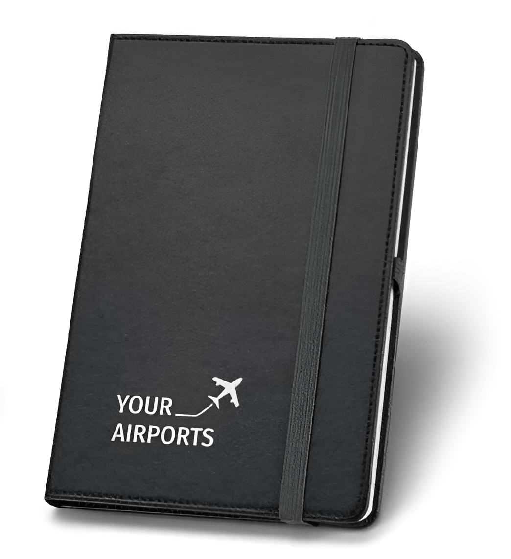 Caderno A5 de capa dura em c. sintético com 96 folhas lisas. Incluso fita separadora, elástico e suporte para esferográfica. Incluso esferográfica de metal. Fornecida com caixa presente. 139 x 216 mm | Caixa: 145 x 220 x 15 mm