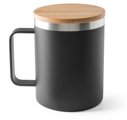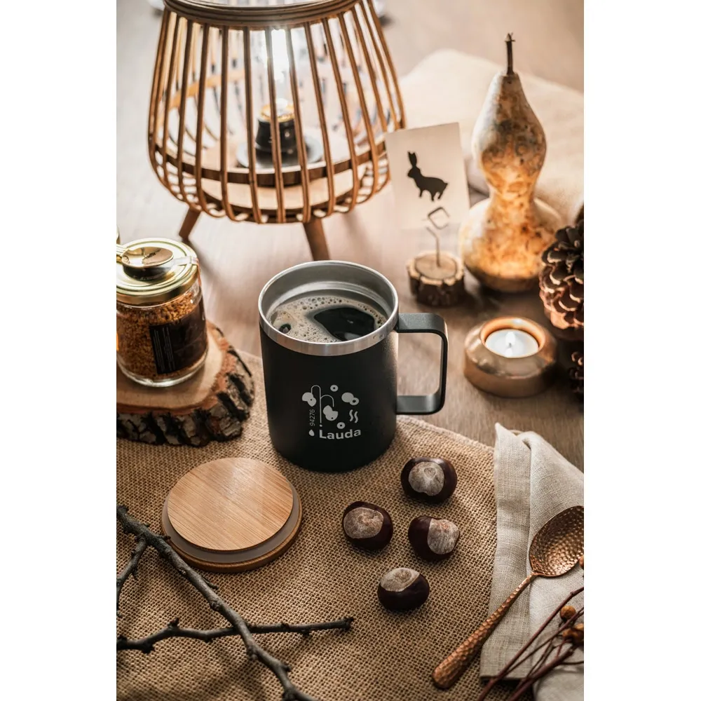 Copo de viagem em aço inox (90% reciclado), térmico com parede dupla isolada a vácuo e tampa em bambu. Capacidade até 420 mL. Fornecido em caixa presente de papel kraft. Certificação EU Food Grade. A cor e o resultado da impressão nos materiais naturais pode variar entre produtos. ø88 x 112 mm
