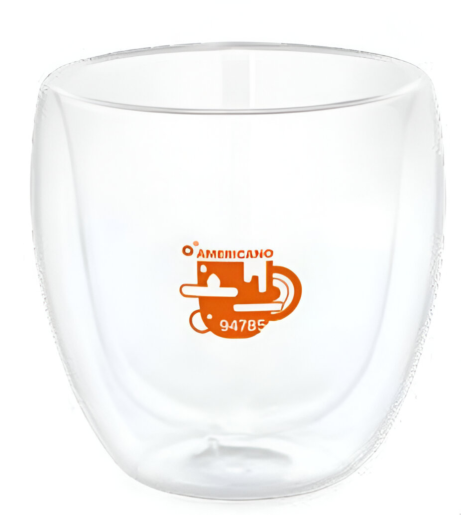 Copo em vidro isotérmico (borossilicato) com parede dupla isolada a ar e capacidade até 220 mL. Fornecido em caixa presente personalizável. Certificação EU Food Grade. ø80 x 86 mm