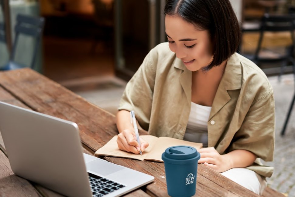 Copo de viagem com tampa e corpo em PP. Capacidade até 450 mL. Certificação EU Food Grade. Ø90 x 135 mm