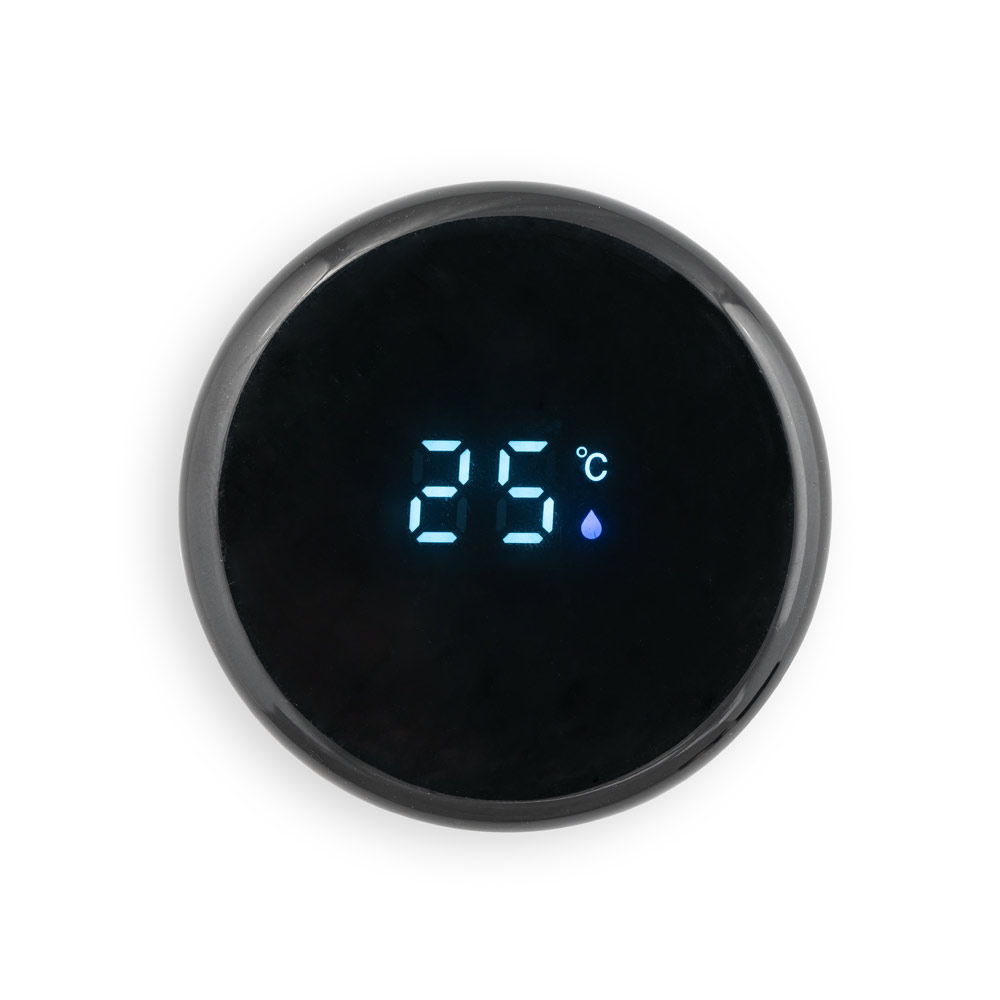 Garrafa em aço inox de parede dupla térmica, isolada a vácuo. Tampa com termômetro digital indicando a temperatura da sua bebida. Incluso infusor para chá. Mantém as bebidas quentes por 8 h e frias por 24 h e tem capacidade até 470 mL. Fornecido em caixa presente. Certificação EU Food Grade. ø65 x 229 mm