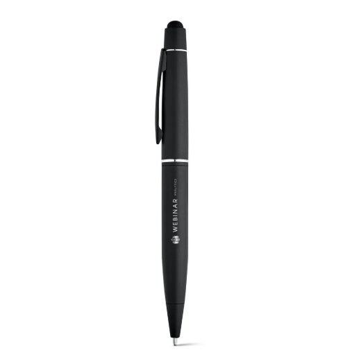Esferográfica em alumínio com mecanismo twist, ponteira touch e clipe de metal. Escrita a azul. Fornecida com bolsa em cartão. ø12 x 136 mm | Bolsa: 155 x 40 mm