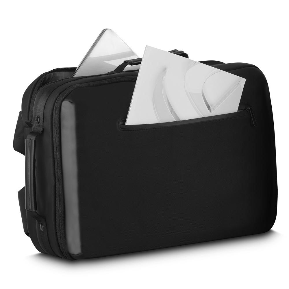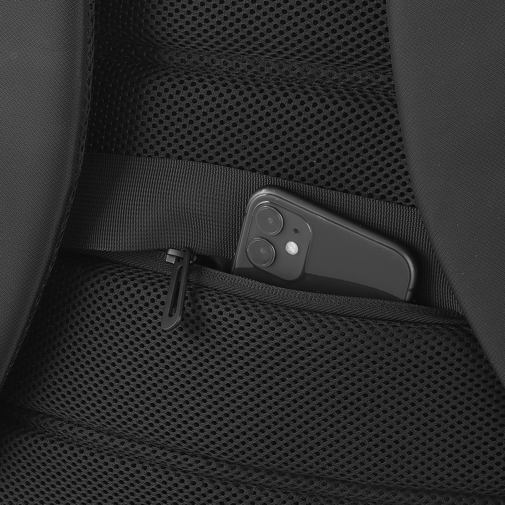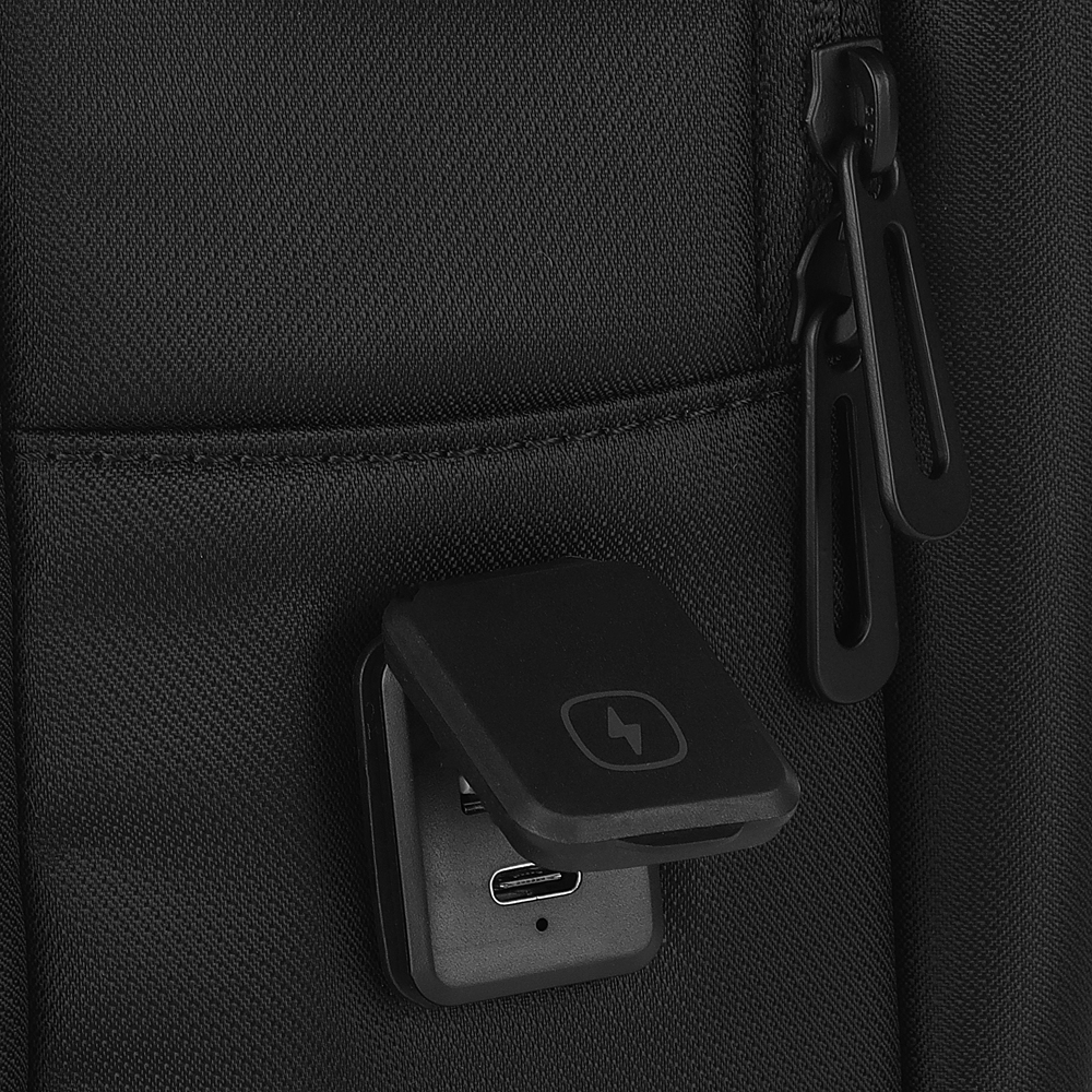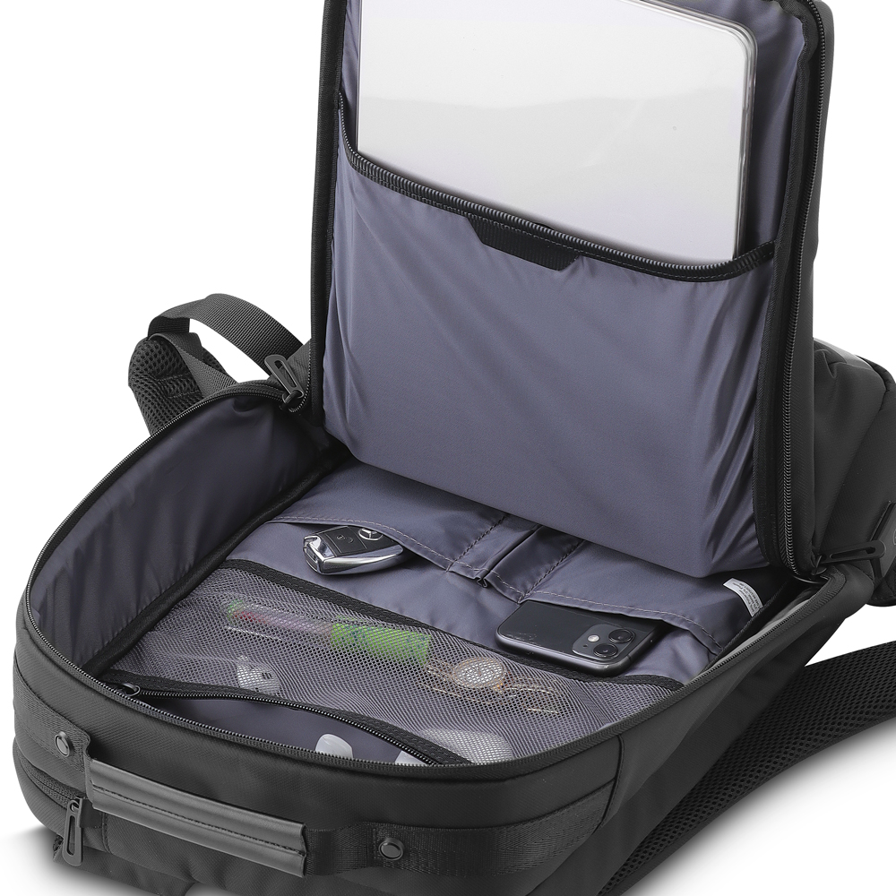 Mochila premium, produzida com poliéster acolchoado e interior em 210D, alças de ombro acolchoadas, interior com divisórias com zíper para acomodar pequenos objetos, bolso frontal com zíper e na parte das costas uma divisória atrás do engate para mala de viagem, aceita notebook de até 15,6”, porta USB na lateral.