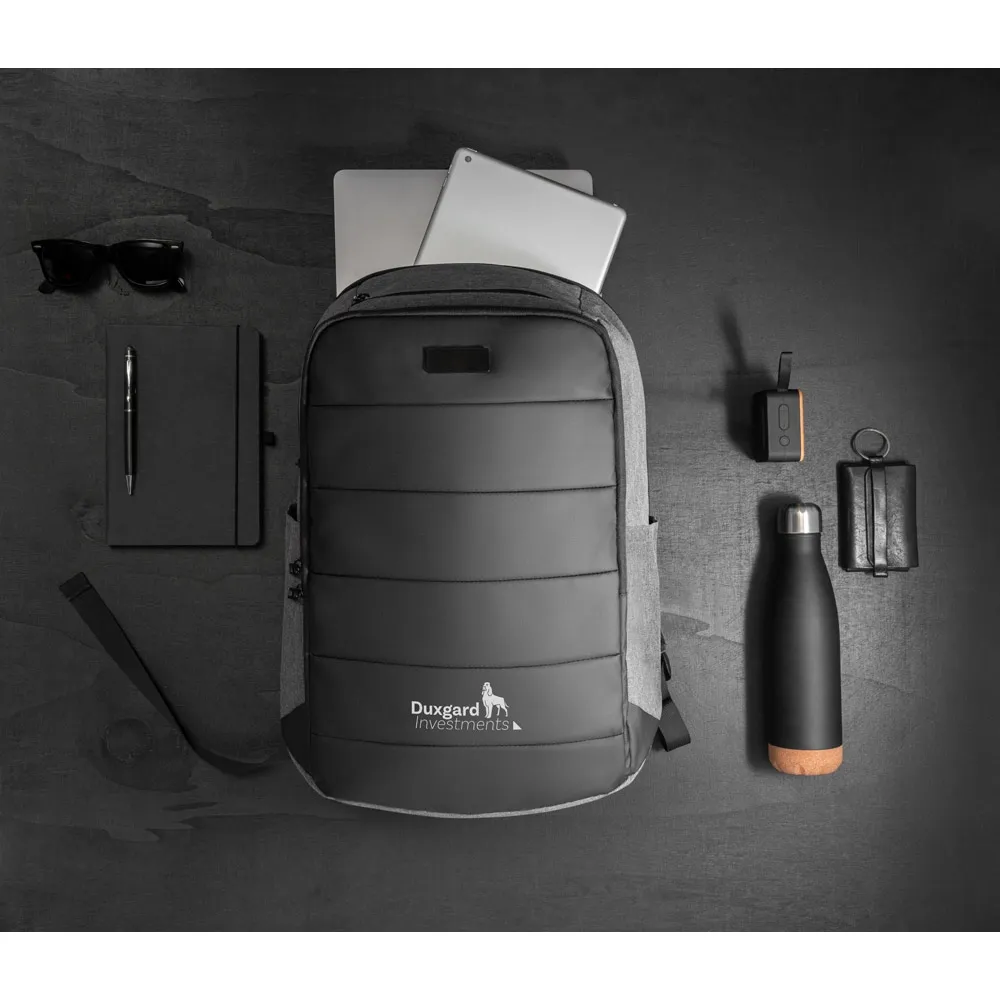 Mochila para notebook em 300D de alta densidade com 2 compartimentos principais. O compartimento posterior tem 2 divisórias almofadadas para notebook até 17 e tablet até 9.7. Tem ainda mais 2 bolsos nas alças (1 com zíper), bolso oculto nas costas da mochila com zíper, bolso no topo com zíper e bolsos laterais com elástico no topo. Contém ainda tira de transporte para trolley e alças e parte posterior almofadadas. Placa metálica removível com imã, para fácil gravação. Capacidade até 21 L. 310 x 480 x 130 mm
