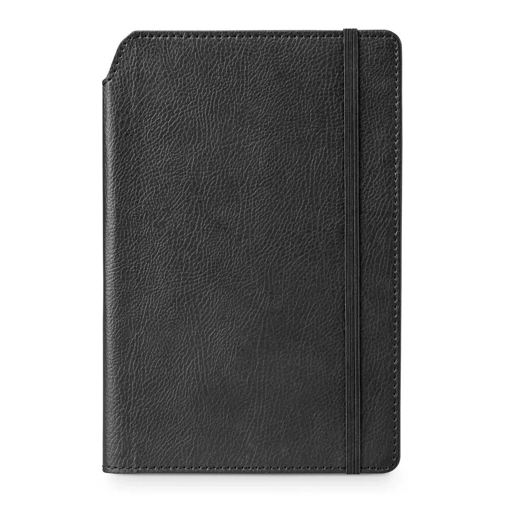 Caderno A5 de capa dura em c. sintético e 96 folhas pautadas. Suporte para esferográfica (não inclusa). Fornecida em bolsa non-woven. 140 x 210 mm