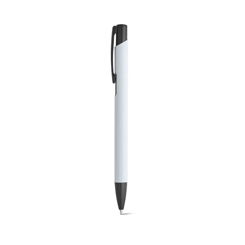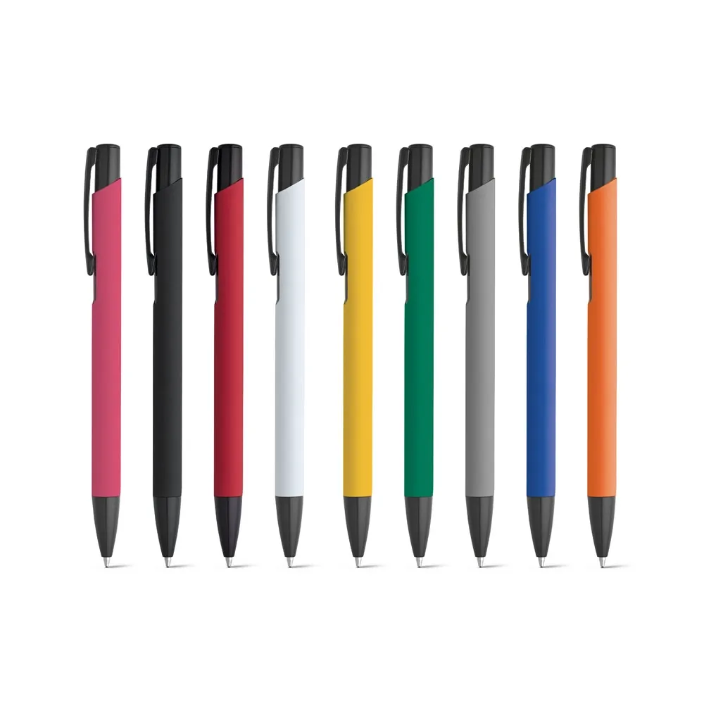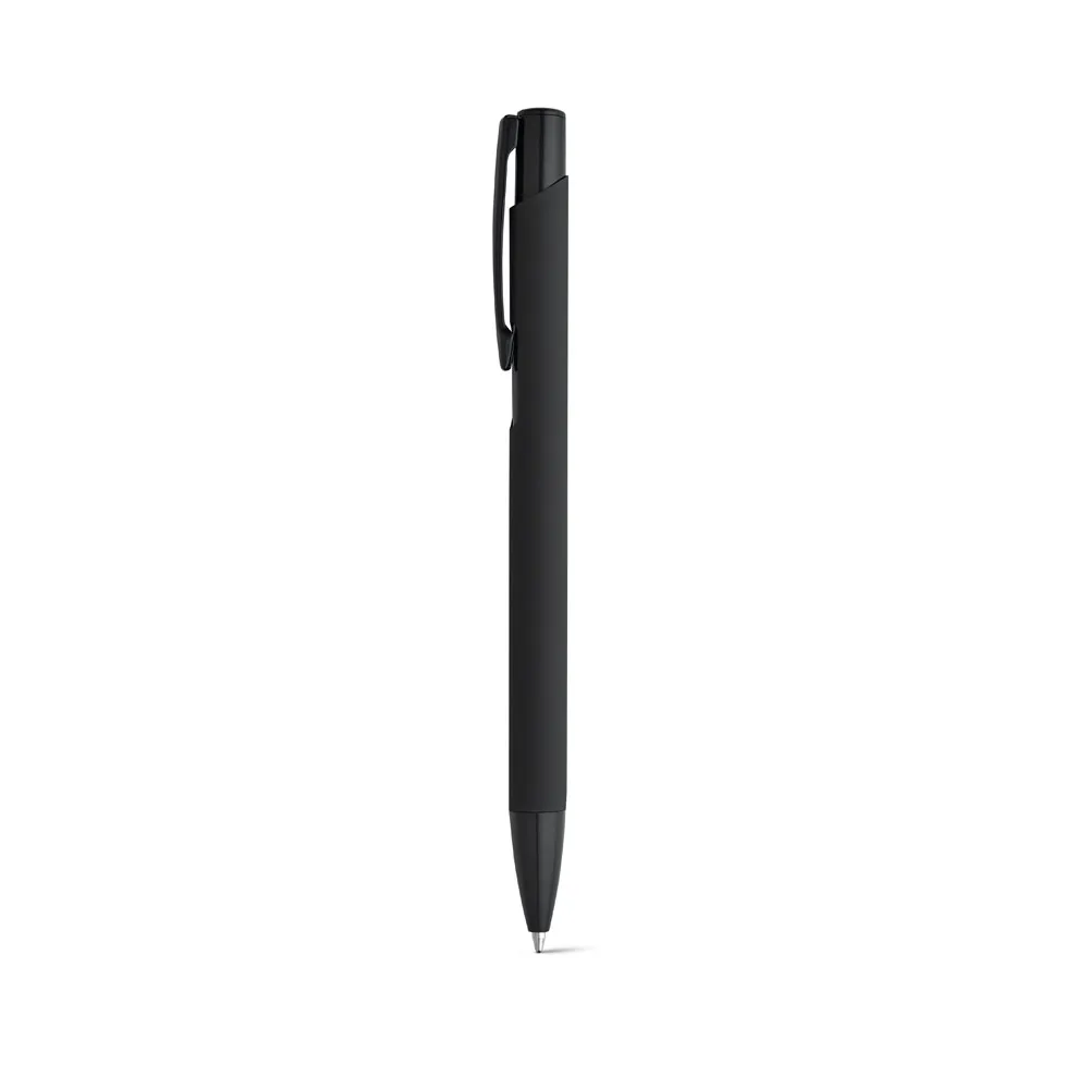 Esferográfica em alumínio com corpo colorido, acabamento emborrachado e clipe de metal. Até 1.5 km de escrita. Escrita em preto. ø10 x 137 mm