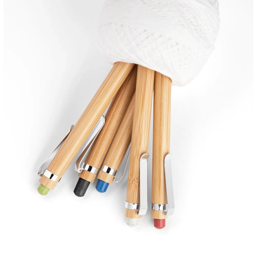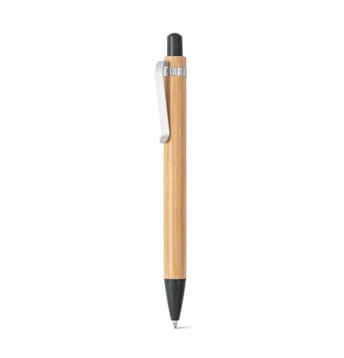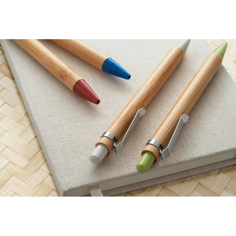 Esferográfica em bambu e clipe em metal. Os elementos coloridos são em fibra de trigo e ABS. Até 1.5 km de escrita. Escrita em azul. A cor e o resultado da impressão nos materiais naturais pode variar entre produtos. ø11 x 142 mm